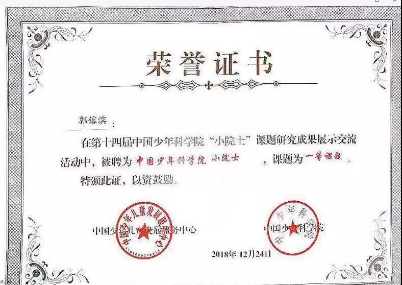 玩轉發明郭溶鑌同學經過初賽、復賽、終評的層層答辯,最終在全國眾多選手中脫!穎!而!出!光榮地當選為第十四屆“中國少年科學院小院士”。
