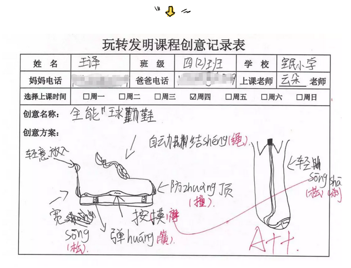 今天我們要介紹的作品是深圳寶民小學王譯同學發(fā)明的——隨行電動按摩鞋,下圖靈感紙則是王譯最初的發(fā)明創(chuàng)意,經(jīng)過多次實驗,修改,最終將“全能球鞋”升級為“隨行電動按摩鞋”。