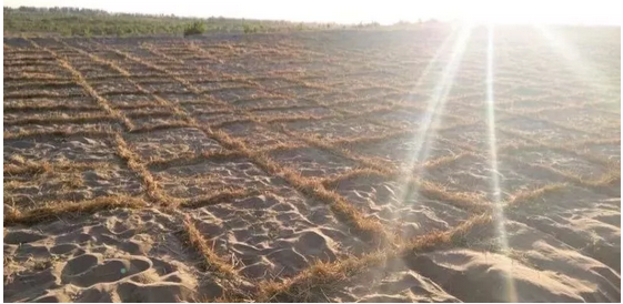 麥草格子,又稱草方格沙障,它是一種防風固沙、涵養水分的治沙方法,網狀的草方格如同無生命的沙漠微型防護帶環環相扣,連成一片,蔚為壯觀。
