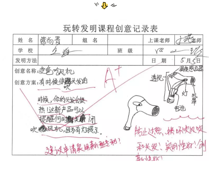 今天我們要介紹的作品是深圳全海小學蔡尚晉同學發明的——感溫智能吹風機,下圖靈感紙則是尚晉最初的發明創意,經過多次實驗,修改,最終將“變色吹風機”升級為“感溫智能吹風機”。