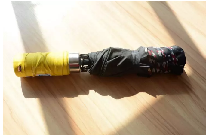 該作品是通過對雨傘傘把和水杯杯蓋進行改造組合而來。用水杯當傘把,可以用來放置一些常用的物品,耳機、鑰匙等,方便取用;同時雨傘的底部有一個暖手裝置,天冷的時候打開就能充當暖手袋抵御寒冷。