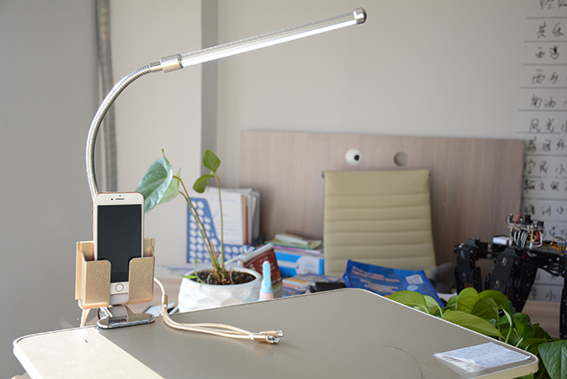 本作品創(chuàng)意是避免玩手機(jī)影響讀書,臺燈須在插上手機(jī)時(shí)才會亮。此臺燈同時(shí)具備手機(jī)充電功能。