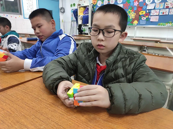 一些同學還能夠舉一反三,對學到的魔方還原技巧進行運用,也幫助其他同學突破難關,一點一點地將手里的方塊旋轉歸位。