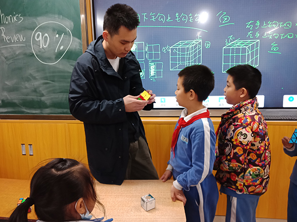 魔方的魅力無窮大,同學們興趣盎然,認真聽講。在活動中,對魔方感興趣的學校老師也加入到同學們中間,一起學習魔方知識。