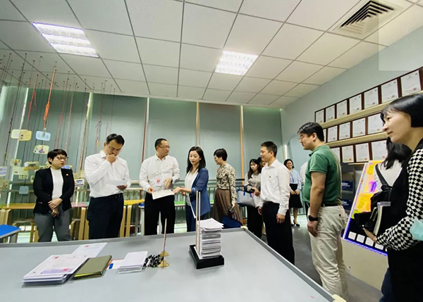 黨工委副書記、區人大桃源街道工委主任、南山區委委員鄧石莊(右3),桃源街道辦事處副主任、建設部部長羅林姣(左3),建設部副部長劉海軍(左2),珠光社區黨委書記張少恭(左1)一行蒞臨我司,聶青龍董事長(左4)陪同。