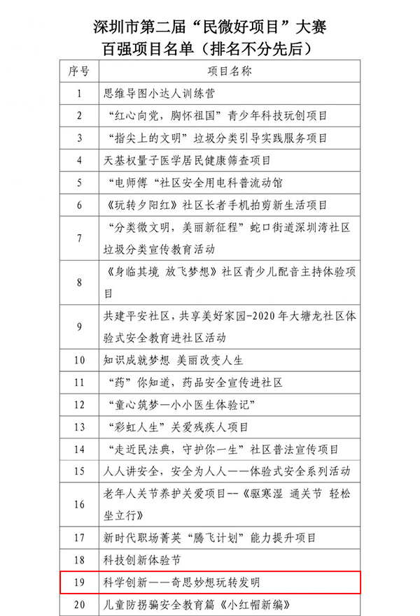 “科技創新體驗節”、“科學創新——奇思妙想玩轉發明”系列課程入選深圳市民政局舉行的第二屆“民微好項目”大賽活動百強名單。