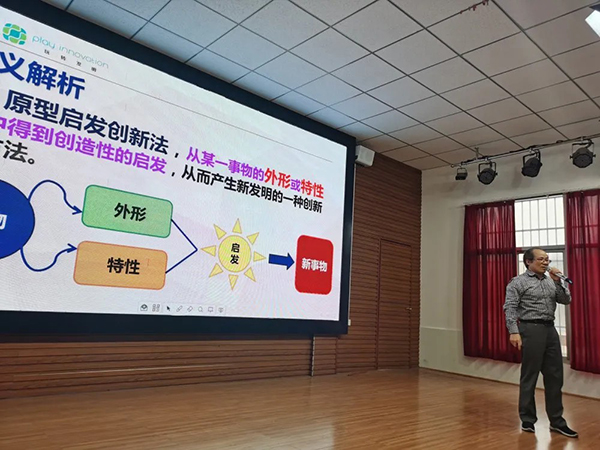 聶教授介紹了兩種發(fā)明方法,一種是原型啟發(fā)創(chuàng)新法,一種是組合發(fā)明法。外形發(fā)明法列舉了生動(dòng)有趣的小故事——鋸子的故事來闡述,組合發(fā)明法則是通過和學(xué)生展開有趣的互動(dòng),讓學(xué)生將兒童手表和橡皮、紅領(lǐng)巾和鑰匙組合在一起,開動(dòng)腦筋發(fā)明出新的東西。聶教授在講座上嚴(yán)謹(jǐn)求實(shí)的科學(xué)態(tài)度和風(fēng)趣幽默的語言風(fēng)格使現(xiàn)場(chǎng)的氣氛達(dá)到了高潮。