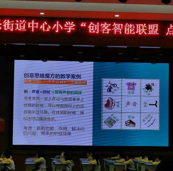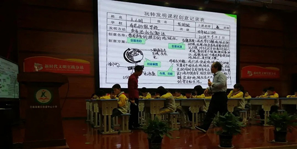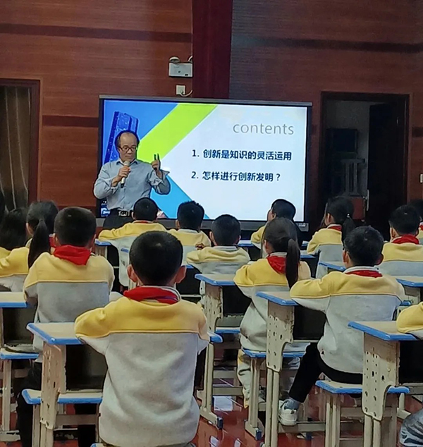 聶教授從康樂街道中心小學同學們的實際情況出發,結合《玩轉發明》實物載體創新發明法的優勢,制定了有效的教學備案,從“創新是知識的靈活運用”和“怎樣進行創新發明”兩個方面,向同學們介紹創造發明的內涵和本質。