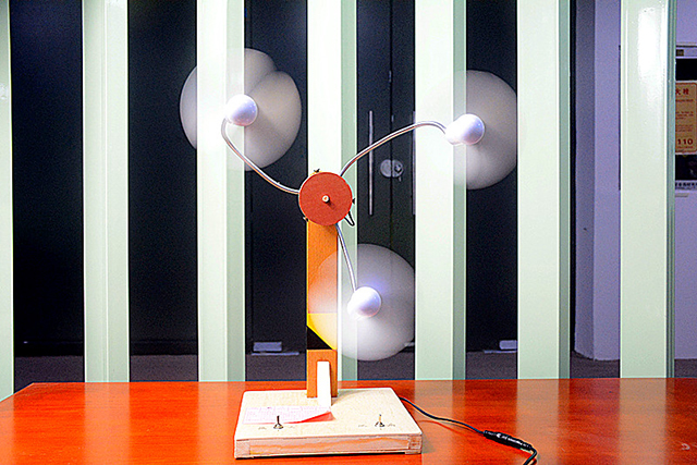 該作品是一個萬向多頭風扇,旨在增加普通小風扇的趣味性和實用性。該作品主要由3個風扇,一個減速馬達,兩個電池盒和木質框架構成。三個風扇主要作用是增加風力,并且均采用萬向結構,當需要吹向多個不同位置時,可任意調整風向;減速馬達是與風扇獨立開來的,一個位置用風時開啟減速馬達可進一步增加風力,另外可通過調整風扇角度,利用減速馬達實現類似普通風扇搖頭的間歇性大面積送風。除這些實用性外,可任意調整的方向與變形的長軸,自轉同時公轉的風扇,相比于普通風扇,也多了幾分趣味性和觀賞性。