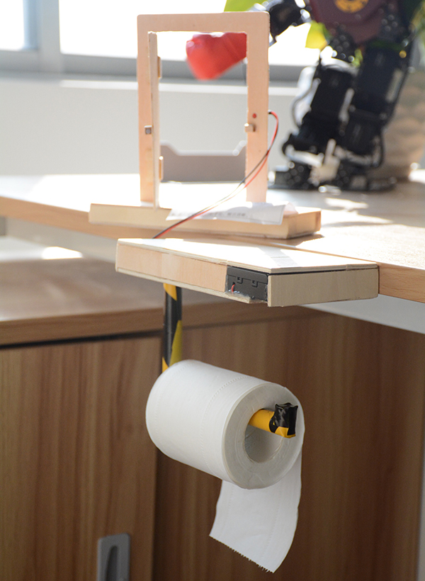 該作品是一個智能洗手間,旨在實現(xiàn)在上公共廁所時,無需開門能直接判斷出該廁所位是非有紙。該作品是通過一個手工制作的模型來模擬實際公共廁所使用的。該作品主要由電池盒、繼電器、紅外感應(yīng)器、指示燈、木質(zhì)框架構(gòu)成的,使用方法也很簡單,只需將衛(wèi)生紙抽去硬皮紙筒或者專門購買沒有硬皮紙筒的衛(wèi)生紙后直接放置在衛(wèi)生紙架上即可(去除硬皮紙筒是因為紅外感應(yīng)器無法穿透較厚的硬皮紙),當衛(wèi)生紙馬上用完或已經(jīng)用完時,紅外感應(yīng)器會被觸發(fā),點亮指示燈。人們便可以通過燈光,簡單清楚地知道該廁所位是否有紙,以節(jié)約上廁所人的時間,同時也提醒工作人員及時添加新紙。