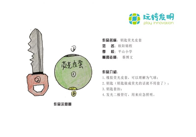 這是來自平山小學歐陽錦程小朋友的的創意——鑰匙熒光皮套,讓你輕松解決找不到鑰匙的煩惱,夜里還可照明哦~(emmmm…小妙這種大頭蝦就非常需要這么一個鑰匙套)