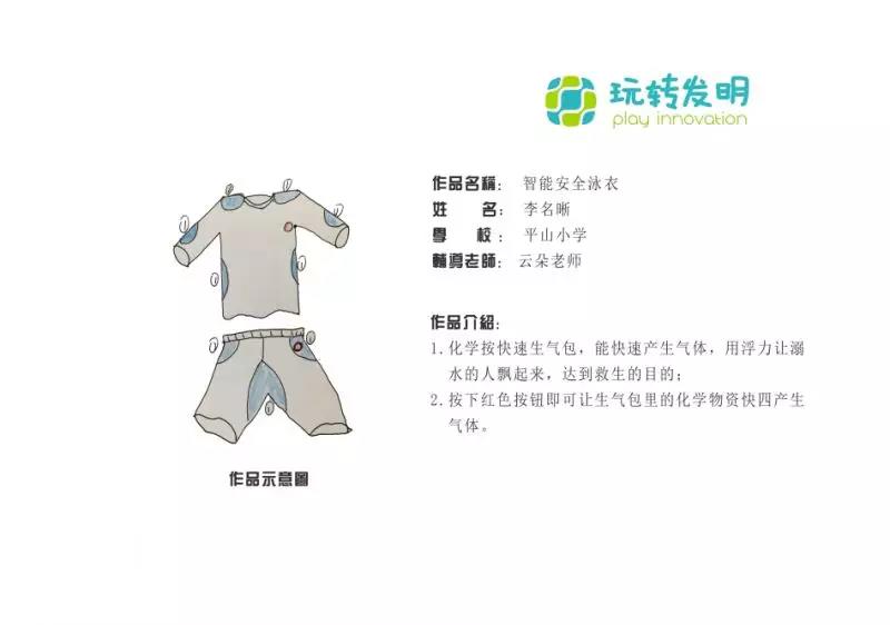 這是來自深圳平山小學李名晰小朋友的創意——智能安全泳衣,物如其名,讓孩子安全去玩水這個暑假。相信很多人都聽到最近的學生溺水事件,有了這個泳衣,就能大大減少孩子溺亡的幾率,減少悲劇發生,超暖心的創意~