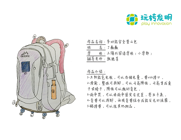 來自上芬小學莫子頡小朋友的創意——多功能登山包,不管你是爬多高的山,背著這么一個包就全都不怕。能發光,能調溫,還能變成睡袋和雨傘。簡直就是哆啦A夢的百寶袋啊!