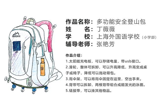 此作品由上海外國語學校丁薇薇設計,可存儲電量,帶USB接口、滑輪,整體可拆卸,帶雨傘架,兩根背帶可組合成能發光的泳圈等。