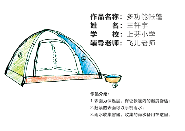 此作品是來自上芬小學王軒宇同學的創意,帳篷表面為保溫層,可保證帳篷內的溫度舒適,干凈的表面可以收集雨水,收集來的雨水可以放進收集容器內備用,野外出行十分有用。