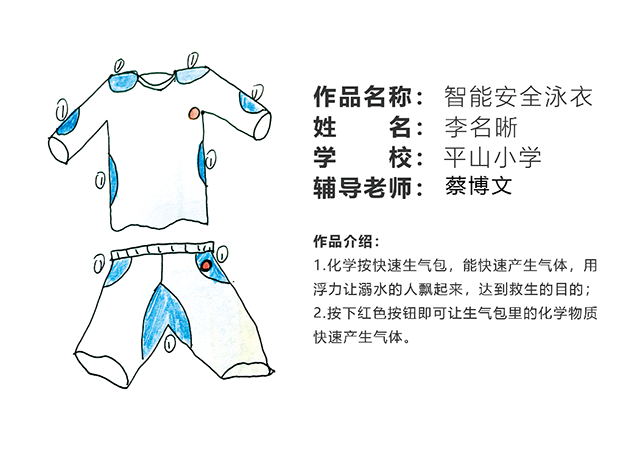 這是來自平山小學的李名晰同學的創意,按下快速生氣包,能夠快速產生氣體,用浮力讓溺水的人飄起來,達到救生的目的。
