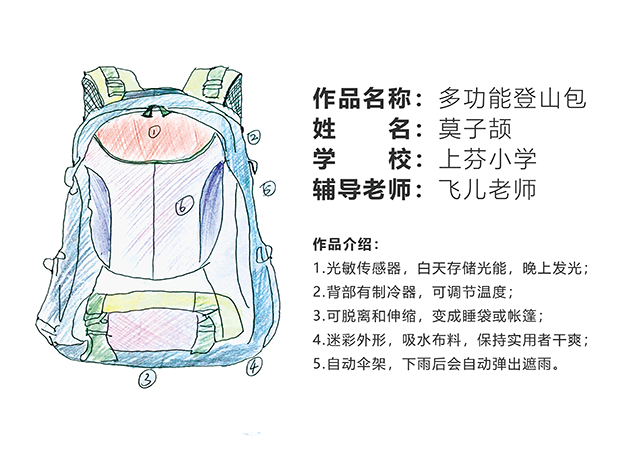 這是來自上芬小學莫子頡的多功能登山包,利用光敏傳感器,白天存儲光能,晚上發光,北部的制冷器可調節溫度,能夠變睡袋或帳篷等,小背包大用處。