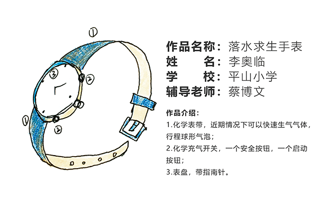 由李奧臨小朋友設計的落水求生手表,內含一個化學表帶,緊急情況下可以快速生成氣體,形成球形氣泡,內含一個充氣開關,一個帶指南針的表盤,如遇緊急情況落水,可啟動按鈕。