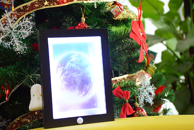 這個作品是一個智能掛畫,在正常情況下掛畫是鏡面的,人眼看不清掛畫的內容,當有人靠近時,畫框下端的人體感應器會感應到人體紅外,繼而觸發掛畫內的LED燈,此時掛畫內容片便會顯現出來。這個作品可以用放在家里當夜燈,也可以用于商業場所的展覽,既實用,又有趣味性。