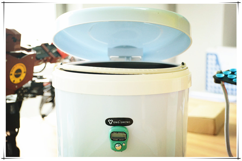 這個(gè)作品是一個(gè)計(jì)數(shù)垃圾桶,功能是可以對(duì)人們開啟垃圾桶的次數(shù)進(jìn)行記錄,通過這樣的一個(gè)方式提醒人們節(jié)約資源,不要亂丟垃圾,提高人們的環(huán)保意識(shí)。這個(gè)作品功能實(shí)現(xiàn)是通過一個(gè)計(jì)數(shù)器來實(shí)現(xiàn)的,計(jì)數(shù)器的計(jì)數(shù)按鍵電路被取出,連接在一個(gè)新的按鍵上,新的按鍵安裝在腳踩的踏板下,每次開啟垃圾桶都需要踩一次踏板,踩下去的踏板就會(huì)壓下按鍵,形成一次計(jì)數(shù)。