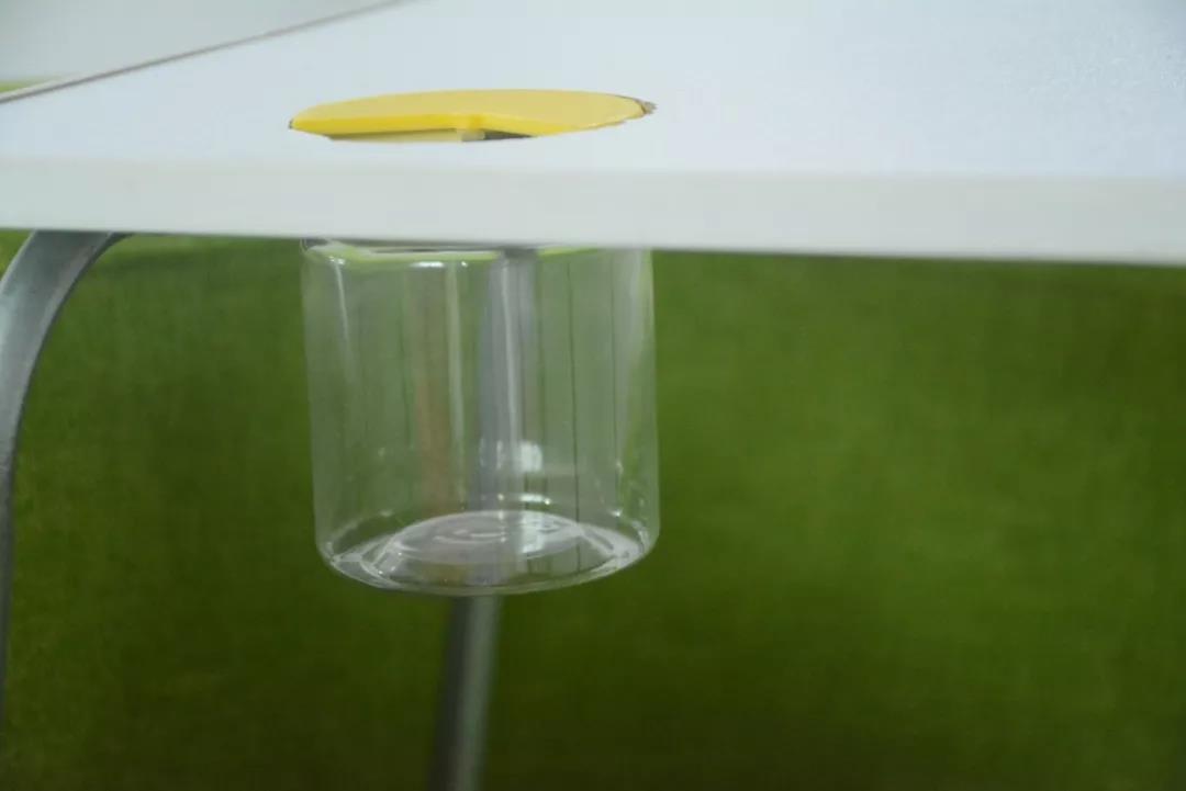 A:是的,我覺得可以擴大它的使用范圍。如用在教室中,上課時我們經常產生一些文具的細小垃圾,通過給桌子加上一個垃圾桶,能夠更好的保持課室的干凈整潔,制作成本較低。使用時,只要將垃圾桶旋開,將殘渣倒入桶內旋回蓋子即可,下課后就可拆開把垃圾倒出去。