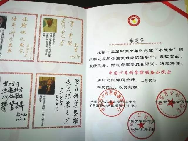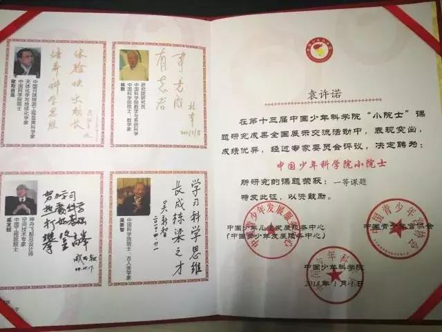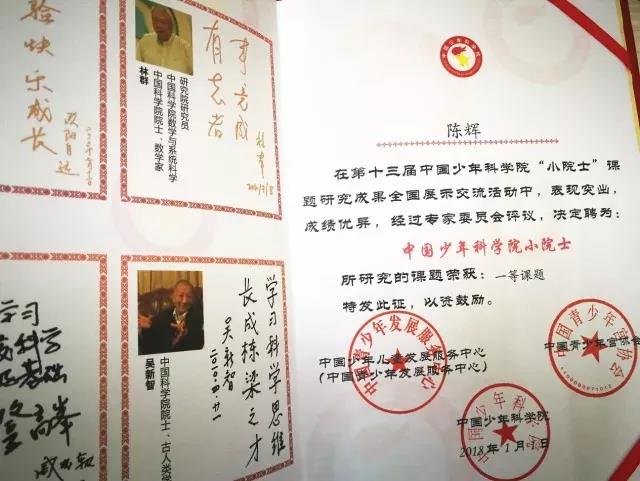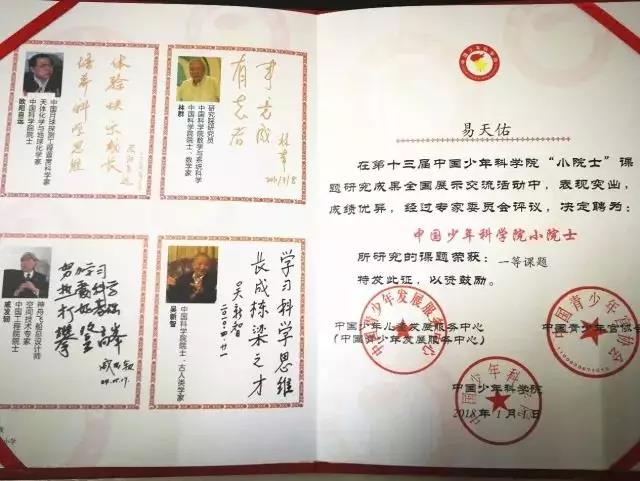 經過自述答辯、專家評審、綜合打分,在全國2000余人的角逐中,我校陳輝、袁許諾、易天佑同學三位表現突出,所研究的課題被評為“一等獎”,并獲得全國“小院士”稱號。
