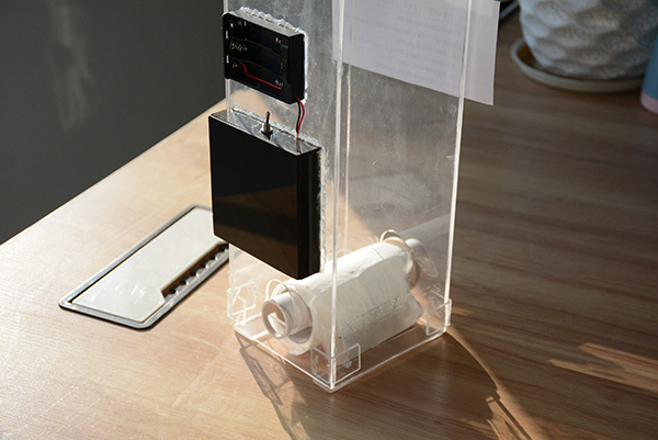 這是一個(gè)方便卷紙架,靈感來(lái)源是生活中時(shí)常會(huì)有人碰到上廁所沒(méi)有紙的情況,出現(xiàn)這一情況的原因之一就是卷紙數(shù)量少,只有一卷,所以可不可以做一個(gè)能同時(shí)容納多卷卷紙的卷紙架呢。這個(gè)作品使用時(shí)和普通卷紙架并無(wú)不同,依舊是拉到合適長(zhǎng)度的紙后扯斷。但是這個(gè)卷紙架可以容納多卷卷紙,當(dāng)一卷卷紙用完以后,只需將橫軸抽出,用完紙的空筒會(huì)自然落下,新的卷紙會(huì)落到開(kāi)口卡住,然后再將橫軸放置回去即可。若卷紙無(wú)剩余存貨的時(shí)候,就會(huì)亮燈提示,增強(qiáng)提示的力度。