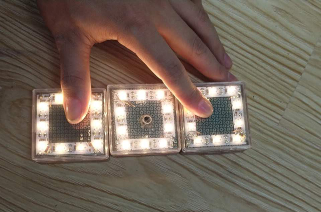 這個作品是一個模塊燈,功能是可以自由拼接組合,這個作品通過制作三個模塊燈來展示效果。作品中的一個是主控燈,裝有電源和開關,其余為拼接燈,沒有電源和開關。當主控燈開啟時,拼接燈可以通過碰觸主控燈被激活點亮,由于三個燈四周均安裝有導電銅條,所以可以在任意面拼接。在使用時,一個是裝飾作用,可以按照需求自由拼接組合;另一個是照明控制,可以通過拼接的數量來控制照明的強弱。
