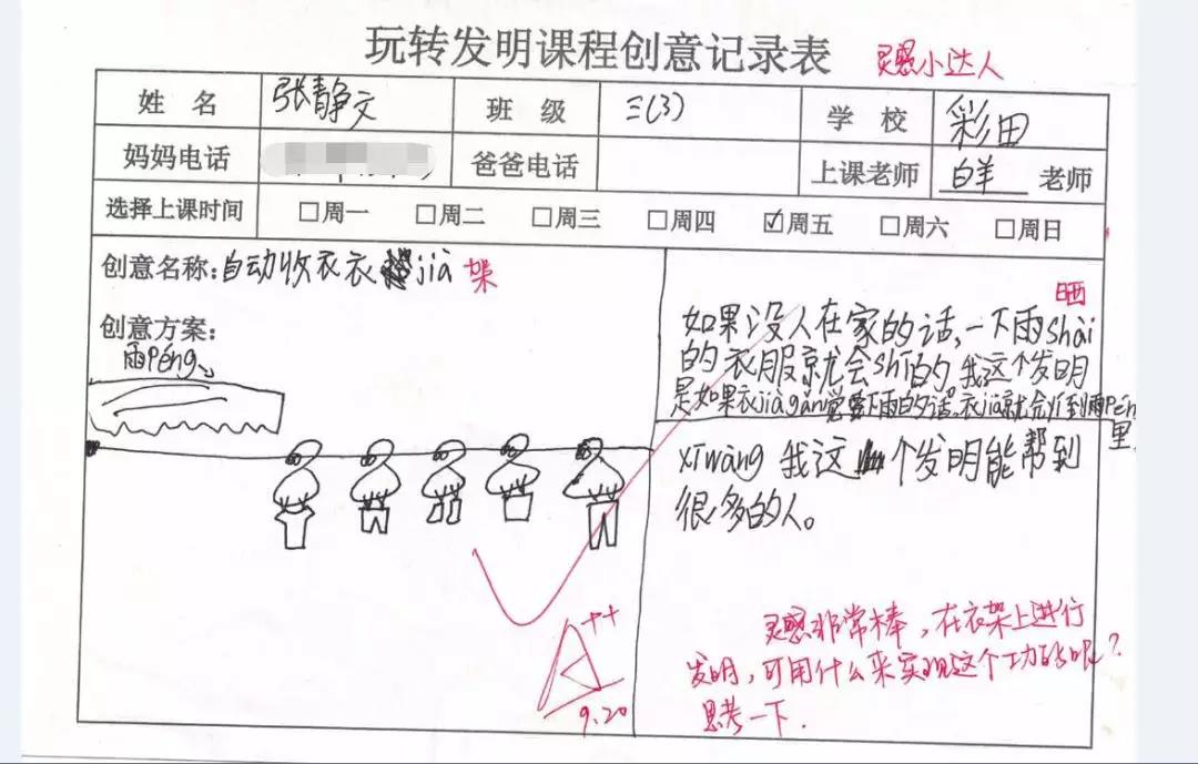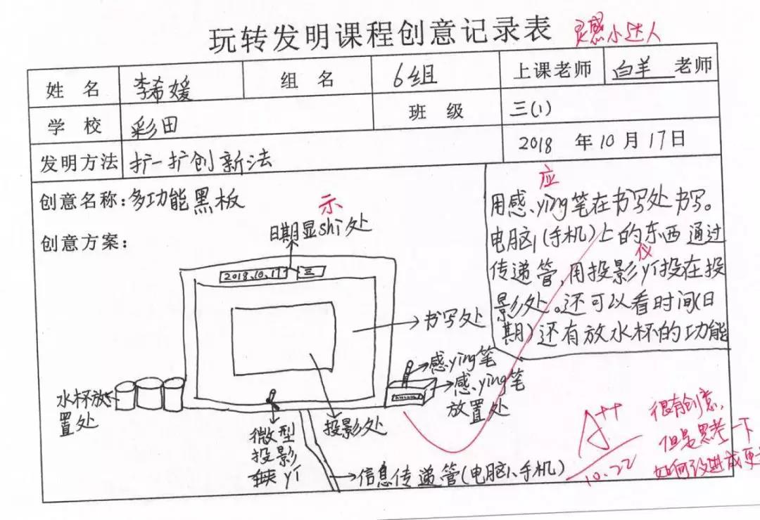 課上孩子們能大膽創新,自然也產生了不少優秀靈感,下面就讓我們進入同學們的發明世界,看看都有些什么創新點子吧!