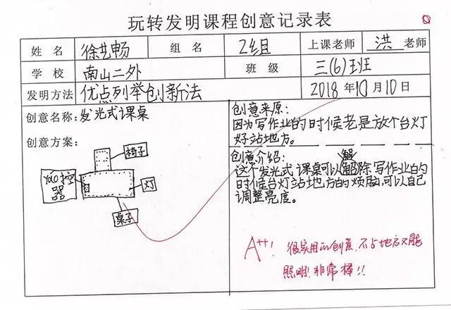徐藝暢同學根據自己在生活中遇到的問題,想出一種發光的課桌,省去了放臺燈的地主,節省了空間,發光時可能根據環境自己調整亮度,使生活更加便捷,觀察力非常強!