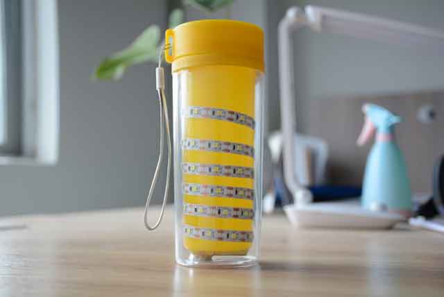 該作品是一個戶外照明水杯,旨在提高戶外活動時的安全性和水杯的實用性。該作品通過對一個雙層水杯結構進行改造,然后加入led強光燈和led燈帶等電子元器件來實現功能的。水杯內鋰電池使用的是可充電式高密度鋰電池,能實現長時間的續航,開關采用按壓開關和撥動開關兩種,撥動開關適合長時間照明使用,按壓開關適合短時間照明和求救時發SOS頻閃時使用。除此以外,水杯的儲水功能也是可以完全正常使用的。